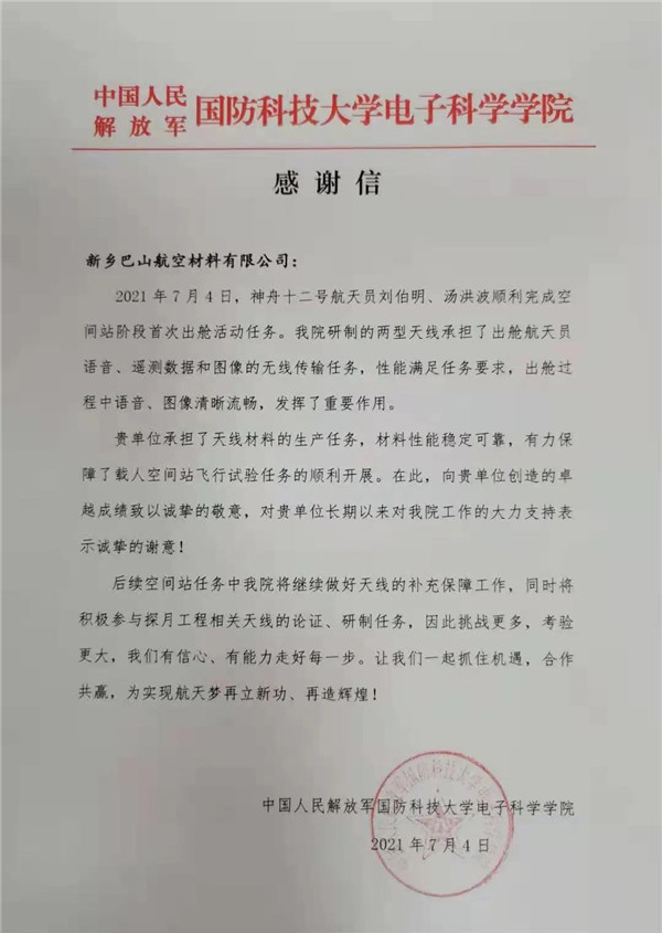在此次發(fā)射任務(wù)中,我公司配套的某材料成功應(yīng)用于空間站天線裝置,材料性能穩(wěn)定可靠,有力保障了載人空間站飛行試驗(yàn)任務(wù)的順利開(kāi)展。近期,中國(guó)人民解放軍國(guó) 防科技大學(xué)為我公司發(fā)來(lái)感謝信。信中稱,向我公司創(chuàng)造的成績(jī)致以誠(chéng)摯的敬意,對(duì)我公司長(zhǎng)期以來(lái)對(duì)其工作的大力支持表示誠(chéng)摯的謝意!